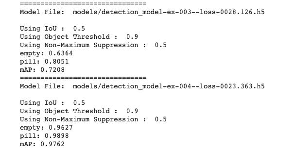 from imageai.Detection.Custom import DetectionModelTrainer trainer = DetectionModelTrainer() trainer.setModelTypeAsYOLOv3() trainer.setDataDirectory(data_directory="dataset") metrics = trainer.evaluateModel(model_path="dataset/models", json_path="dataset/json/detection_config.json", iou_threshold=0.5, object_threshold=0.9, nms_threshold=0.5)